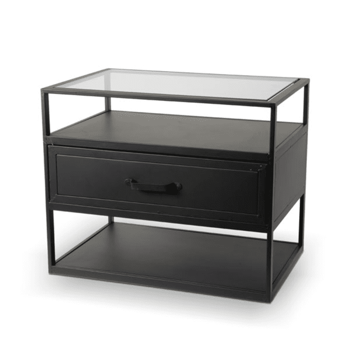 שידת צד מעוצבת דגם LALI מתכת שחורה מגירה ומדף זכוכית