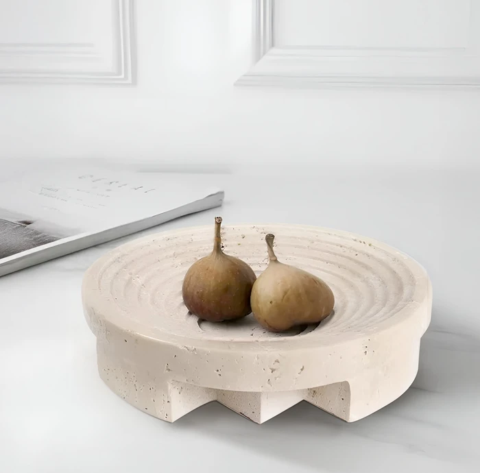 מגש קערה עגולה על רגל נמוכה דגם GOSHEN בגוון טרוורטין דמוי אבן טבעית