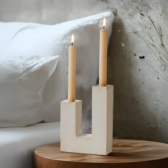 פמוט כפול 2 קנים דגם GOSHEN דמוי אבן בגוון טרוורטין
