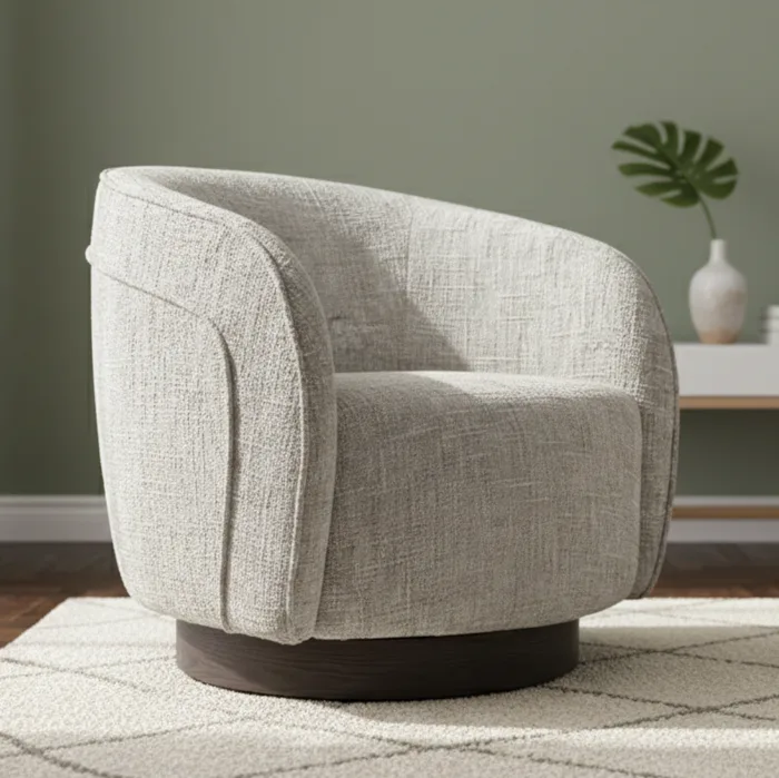 כורסא עגולה מסתובבת מעוצבת דגם KALA בד גוון בז' MIX מהמם בעיצוב מודרני ונקי בשילוב בסיס עץ גימור אגוז כהה