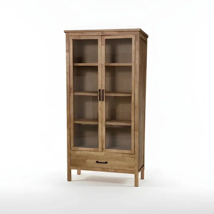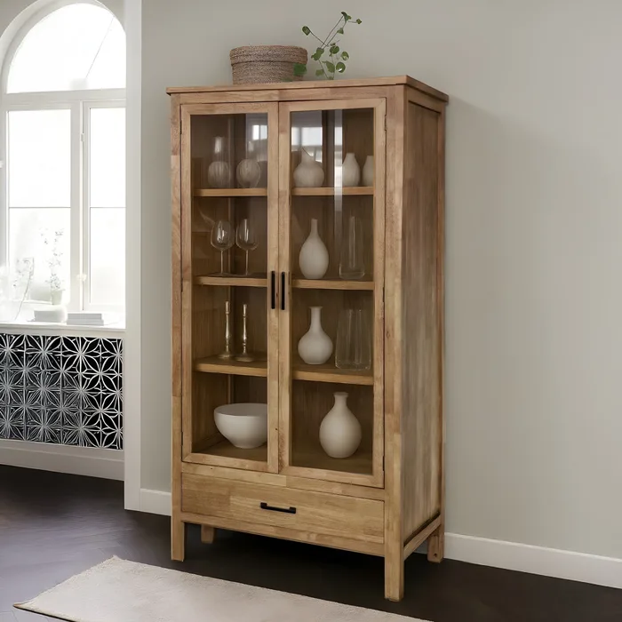 ויטרינה מעוצבת דגם ALBA עשויה עץ בגימור טבעי 2 דלתות זכוכית ומגירה תחתונה רחבה עם ידיות שחורות ורגליים ישרות מעץ ליציבות גבוהה