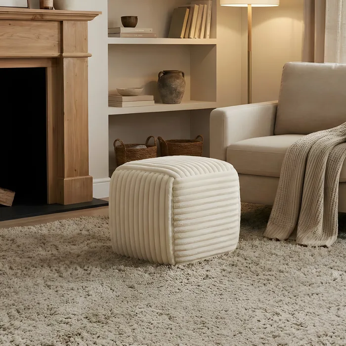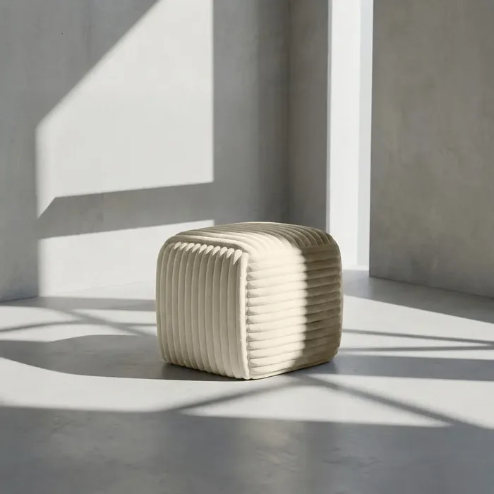 הדום זה הוא הרבה מעבר לרהיט – הוא פריט עיצובי שמשדרג כל פינה. הוא מתאפיין במבנה גיאומטרי מדויק ובטקסטורת פסים פרוותים בולטות המעניקה לו מראה עשיר, תלת-ממדי ומגע מלטף. העיצוב המינימליסטי והצבע הבהיר מאפשרים לו להשתלב בהרמוניה בסלון, בחדר השינה או בפינת הקריאה.