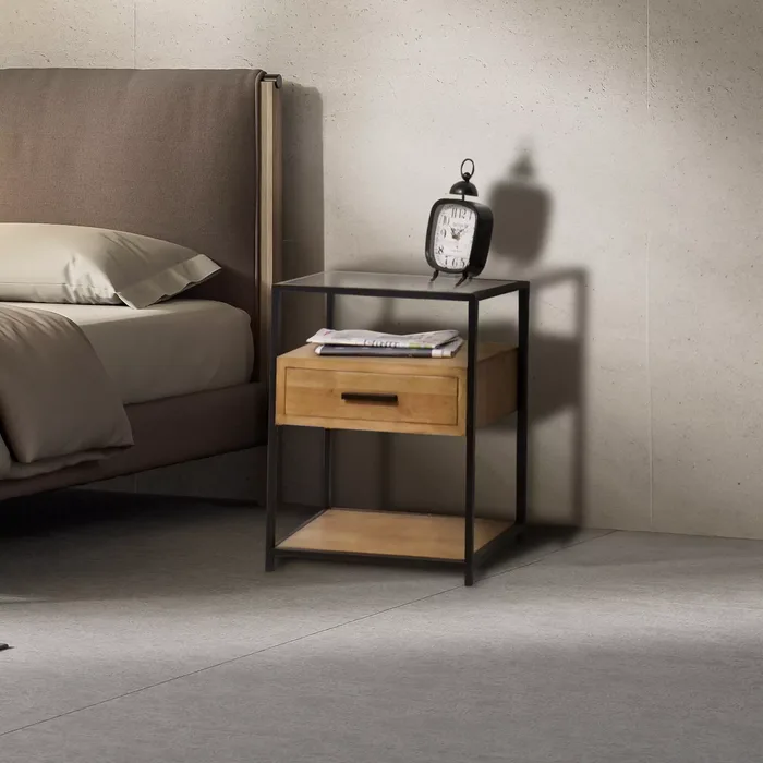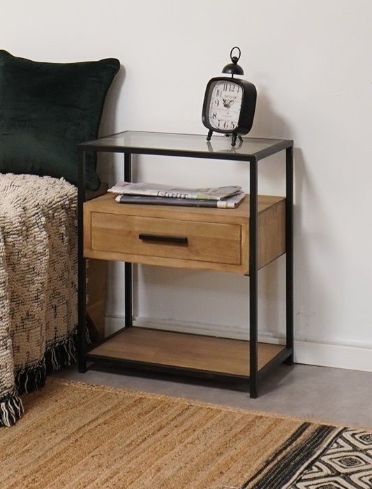 שידת צד מעוצבת YORK מדף זכוכית מגירת עץ ומסגרת שחורה