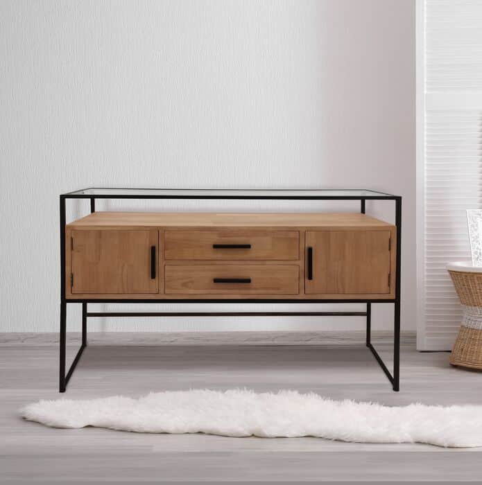 קונסולה מעוצבת YORK עץ בשילוב מסגרת שחורה ומדף זכוכית מעל-2 דלתות 2 מגירות