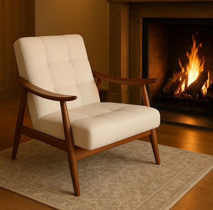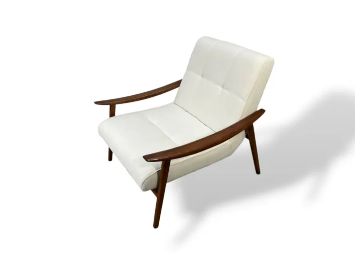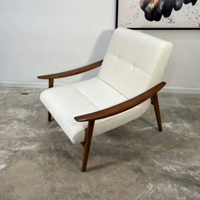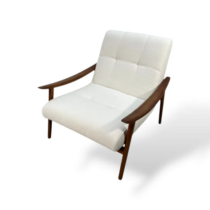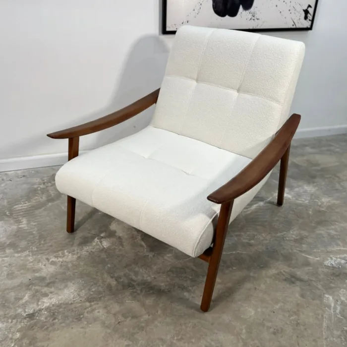 כורסא מעוצבת דגם RUMMY בד בוקלה לבן ועץ בגוון אגוז אמריקאי
