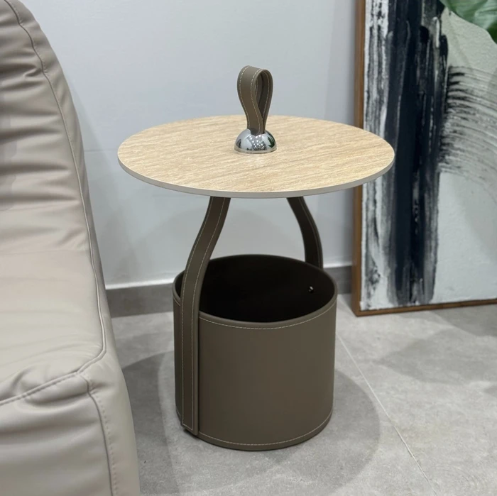 שולחן צד מעוצב דגם CHARLIE פלטת פורצלן טרוורטין ודמוי עור מוקה