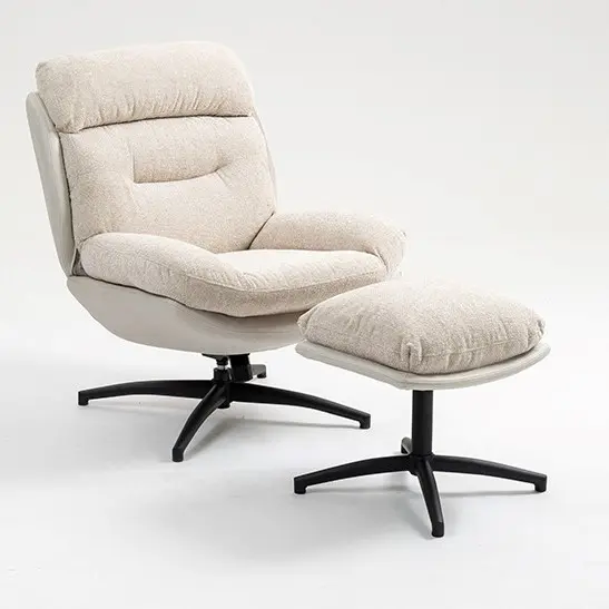 כורסא והדום מעוצבים דגם KLASEN בסיס הכורסא דמוי עור קרם בשילוב בד אריג גוון קרם מהמם בעיצוב מודרני ונקי ורגלי מתכת שחורה חזקה ויציבה בעיצוב איקס עם פרופורציות מינימליסטיות שמעניק לה מראה אלגנטי ומדוייק לחלל שלכם,מגיע עם מנגנון נדנוד לנוחות מירבית.